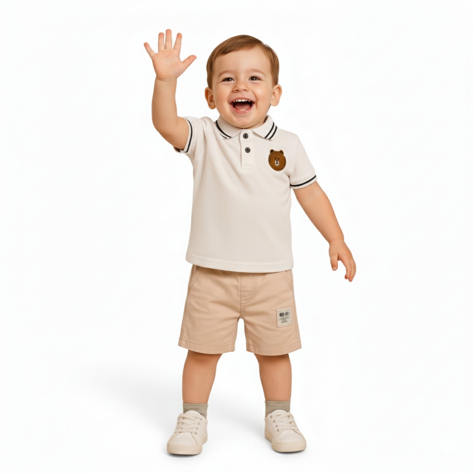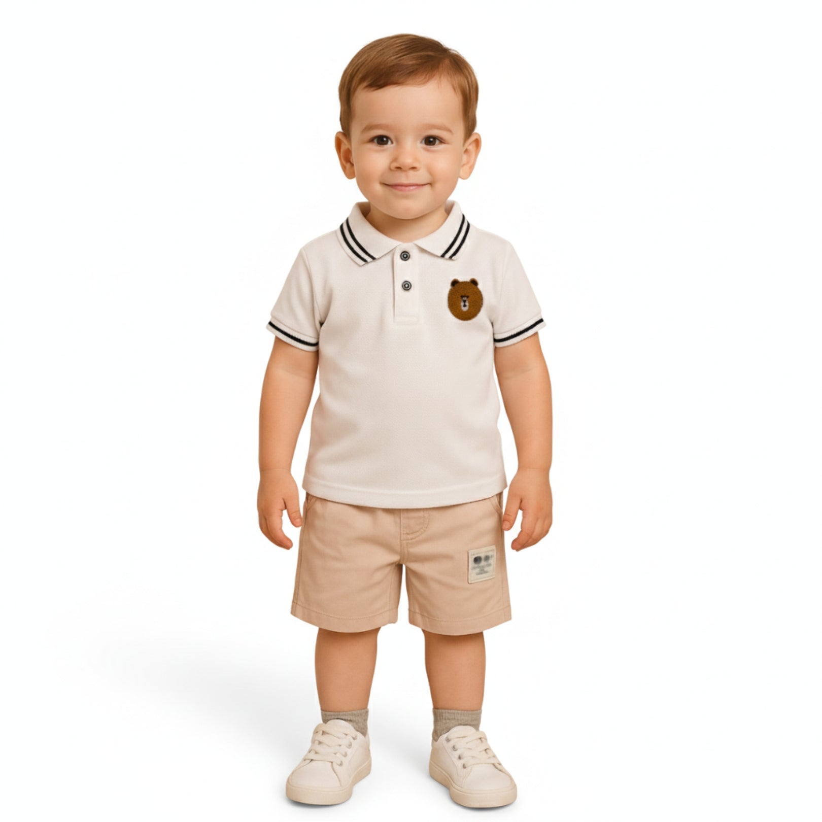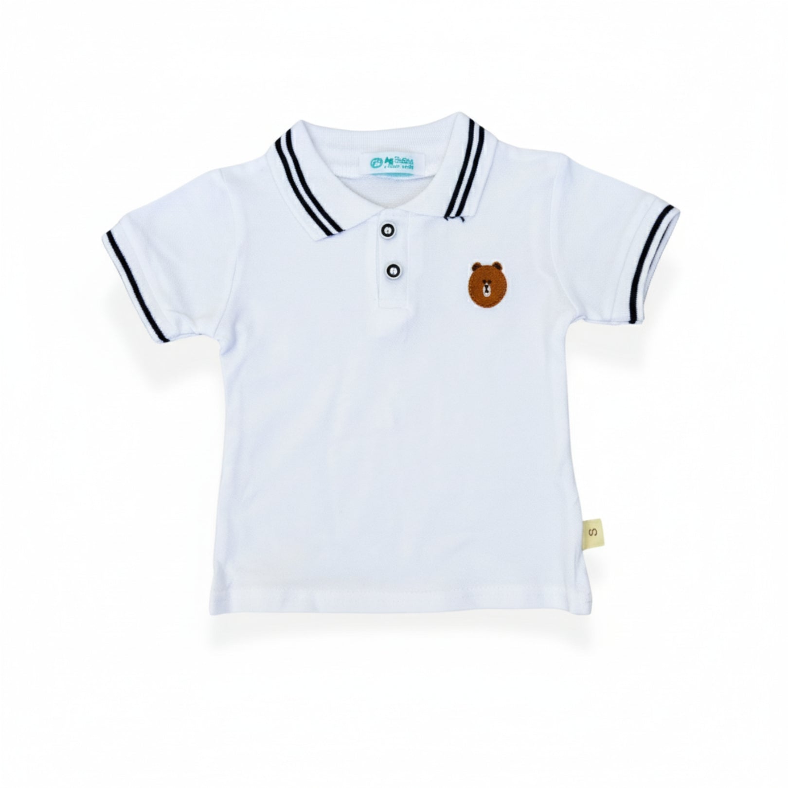 - Polera con cuello y botones frontales, y bordado de la cara de un osito en el frente.