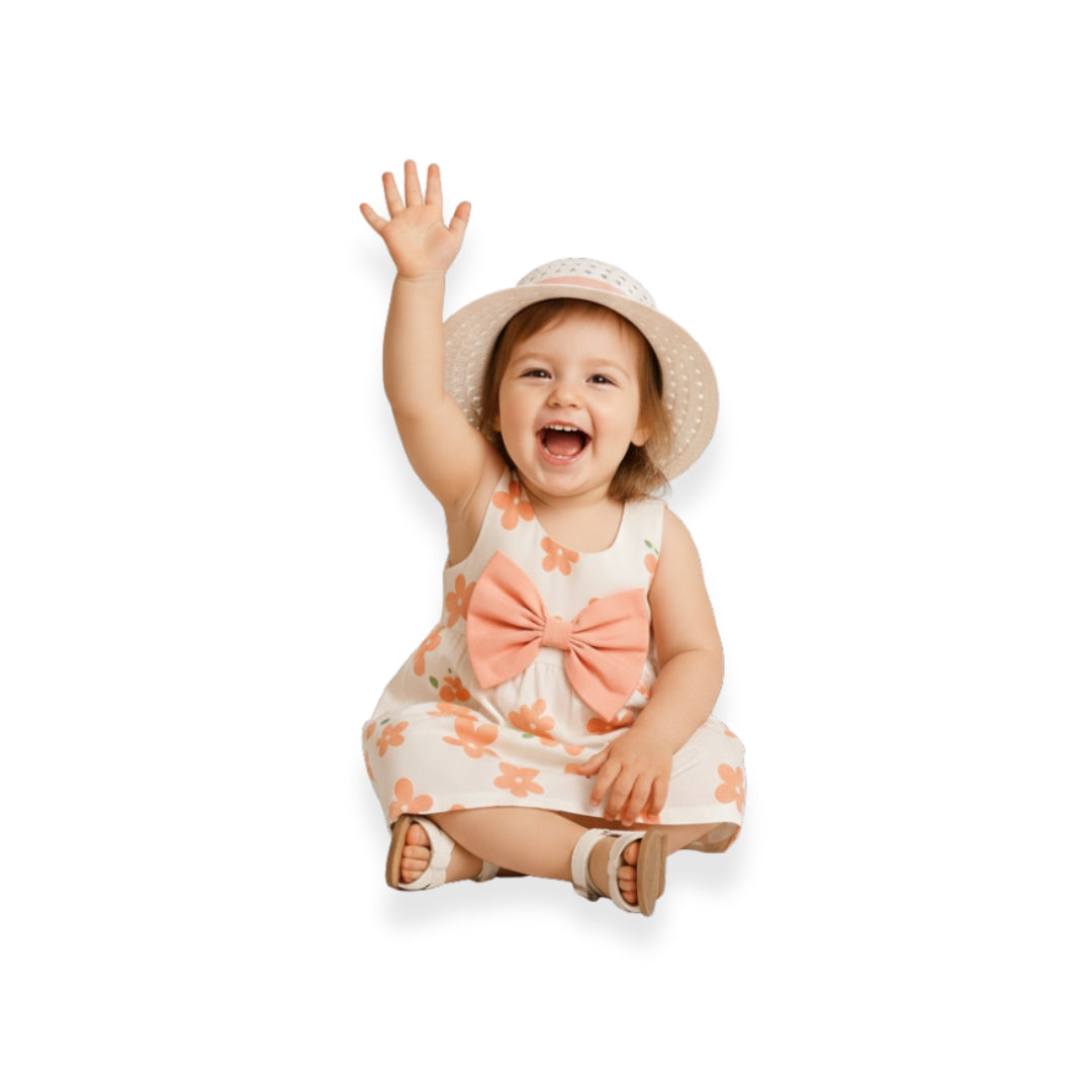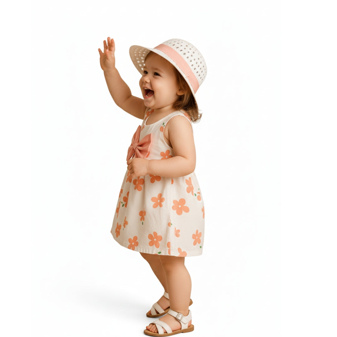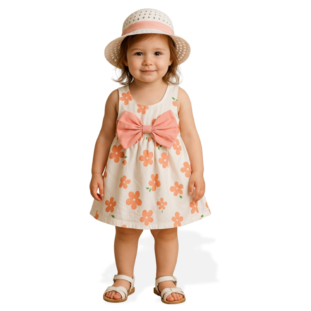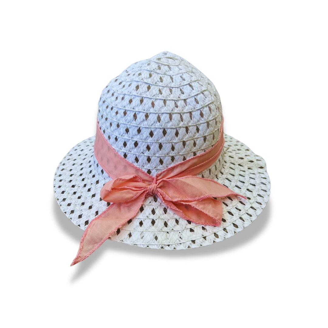 - Sombrero blanco con una cinta hecha de la misma tela del vestido, ideal para complementar el conjunto.