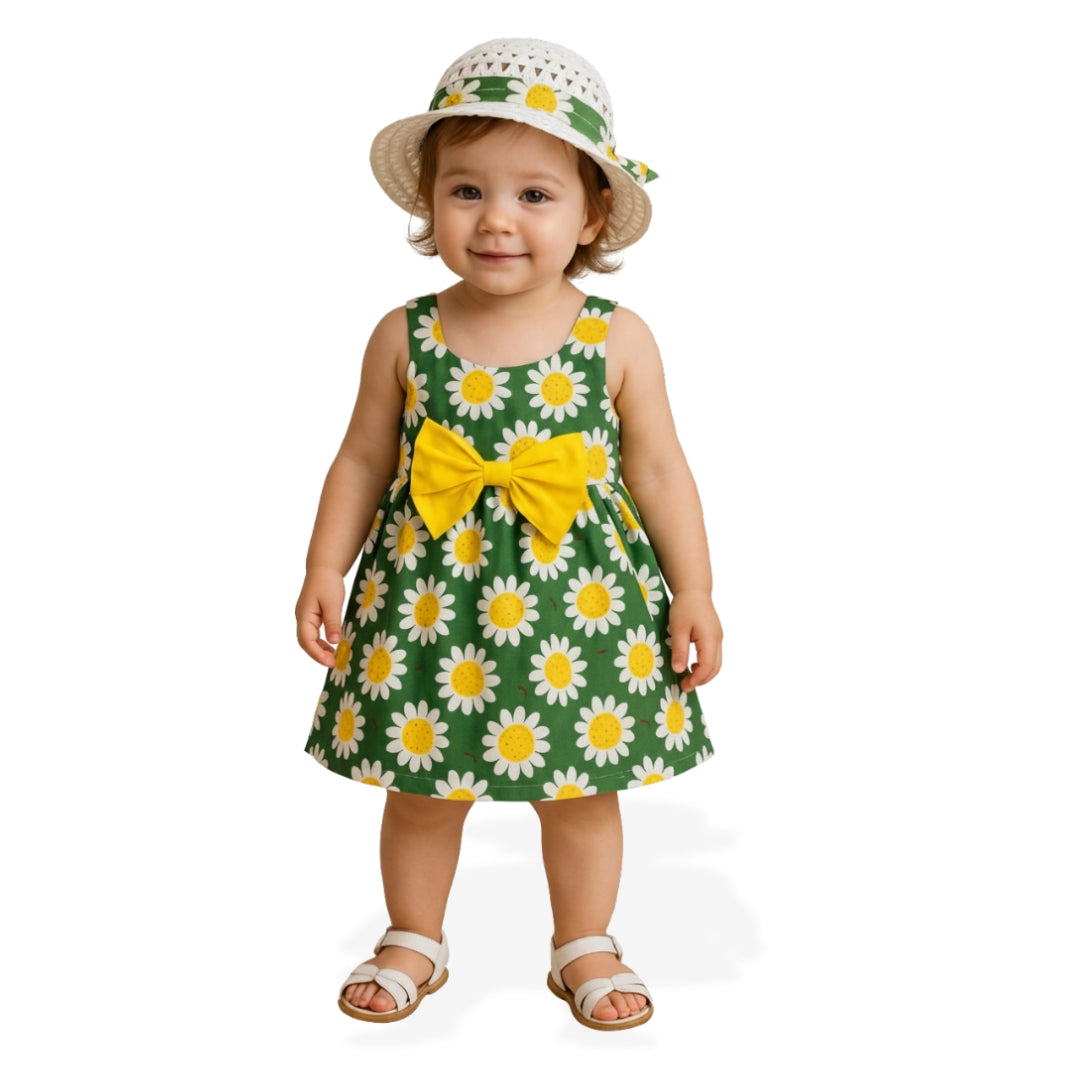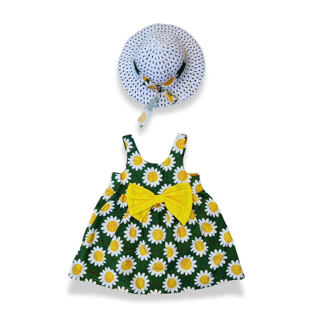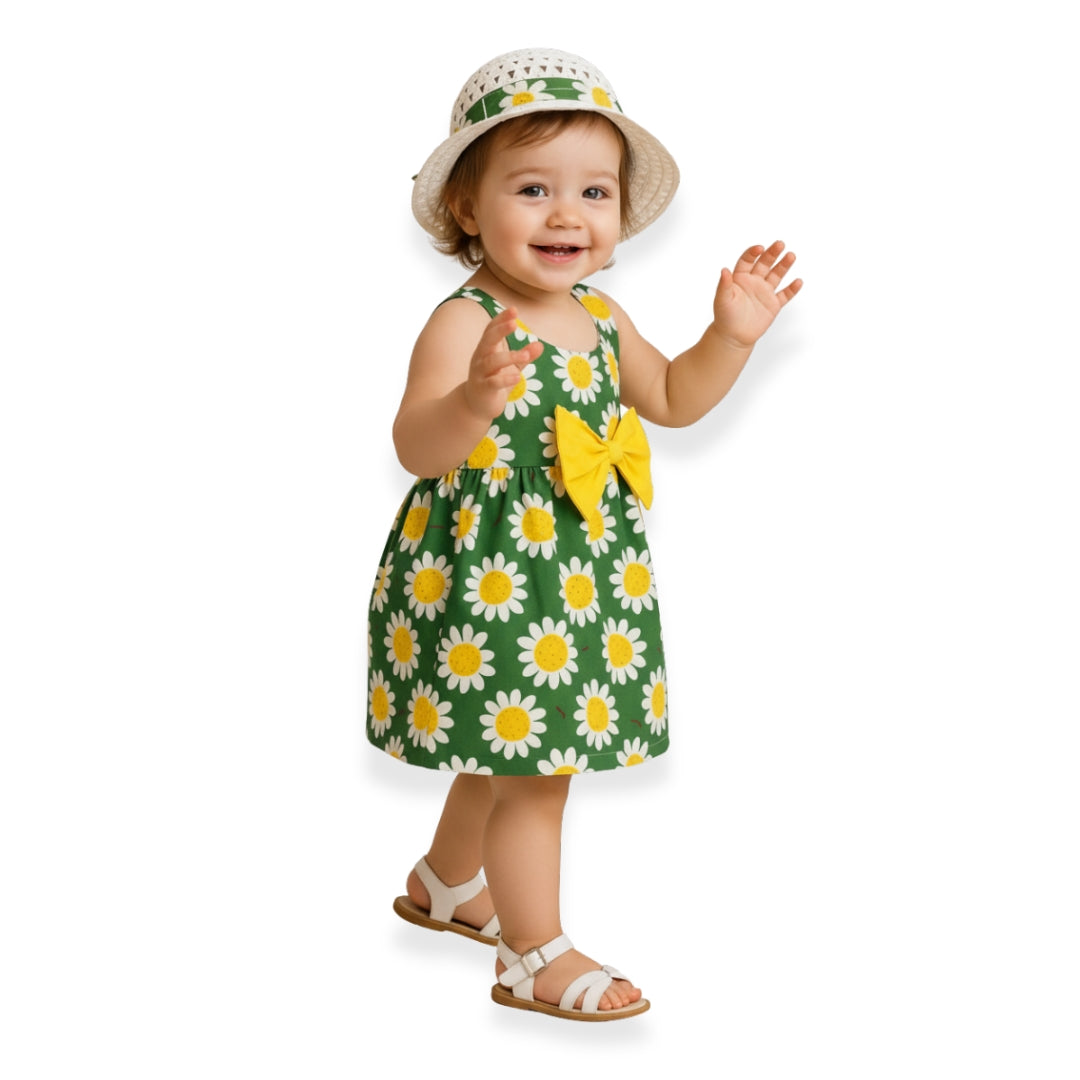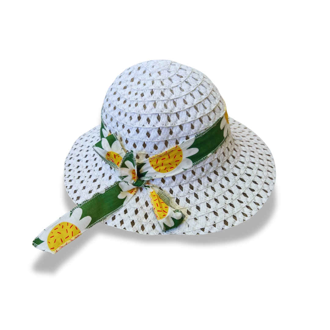 - Sombrero blanco con una cinta hecha de la misma tela del vestido, ideal para complementar el conjunto.