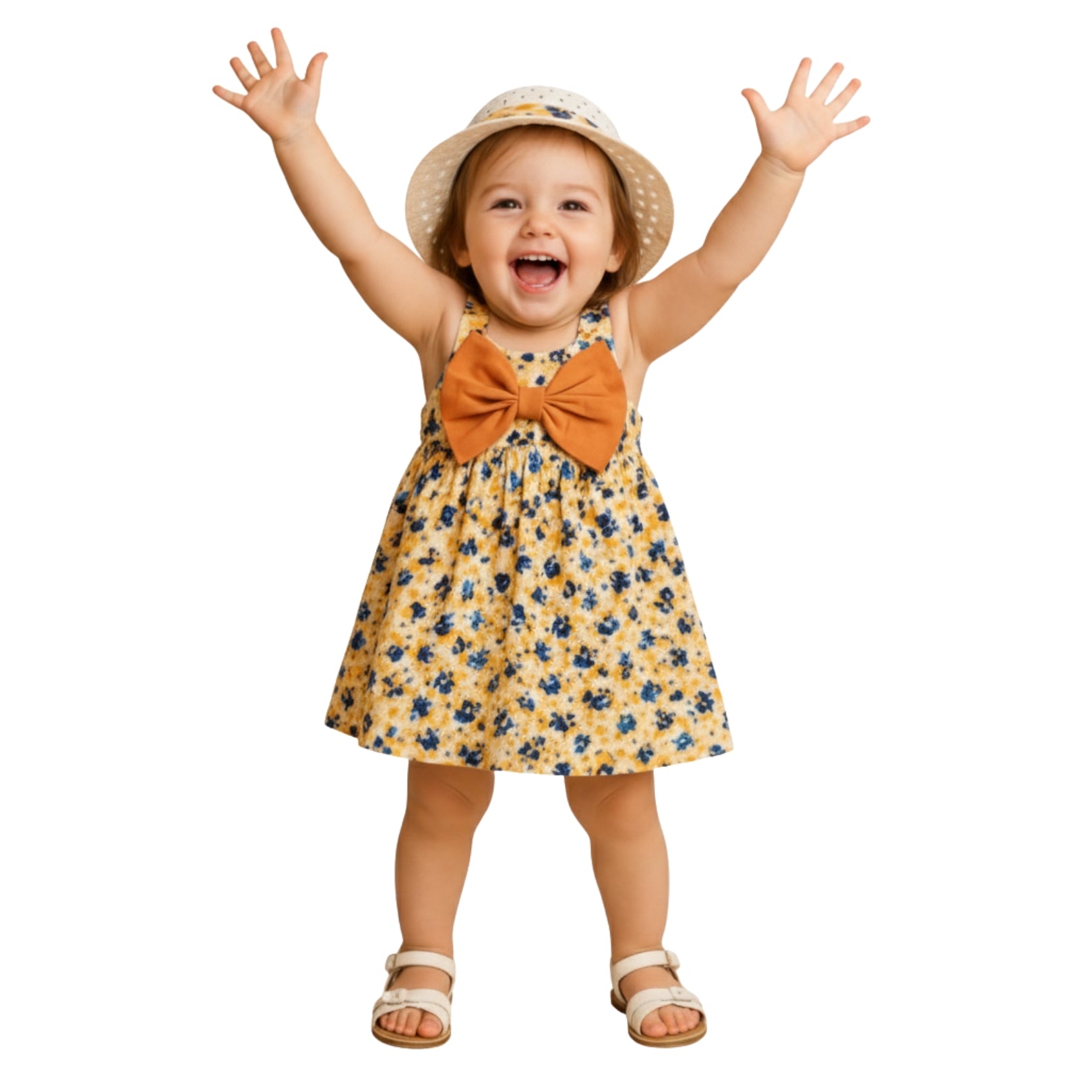 - Sombrero blanco con una cinta hecha de la misma tela del vestido, ideal para complementar el conjunto.
